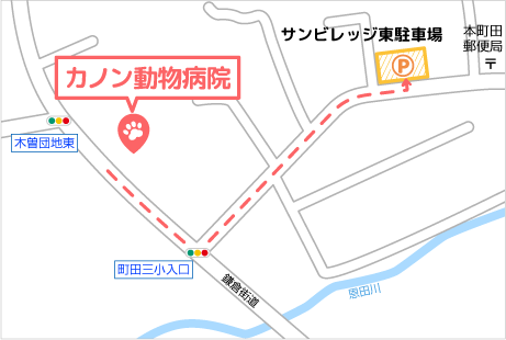 - カノン動物病院の駐車場は、病院から3分ほど離れた場所にございます。